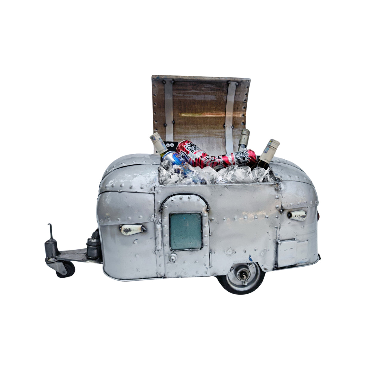The Barnyard Airstream Cooler is a whimsical, functional beverage tub crafted in the shape of a classic vintage airstream trailer. Made from durable metal, it features a hinged lid for easy access and ample interior space to keep drinks chilled over ice. Its eye-catching design makes it a conversation starter, perfect for outdoor parties, backyard barbecues, or as a decorative centerpiece for gatherings.