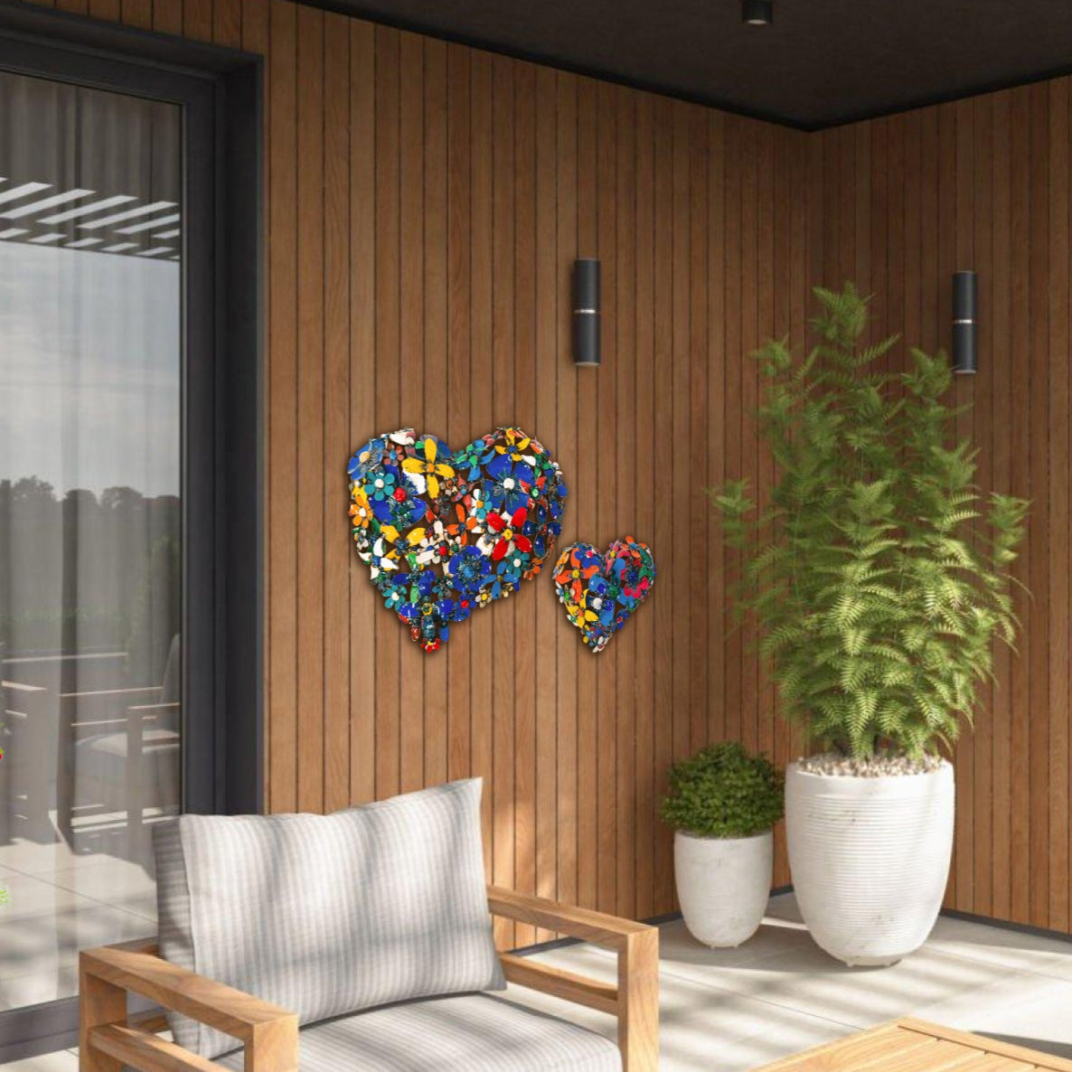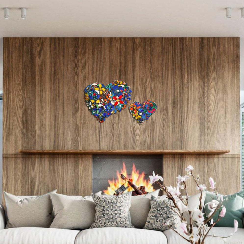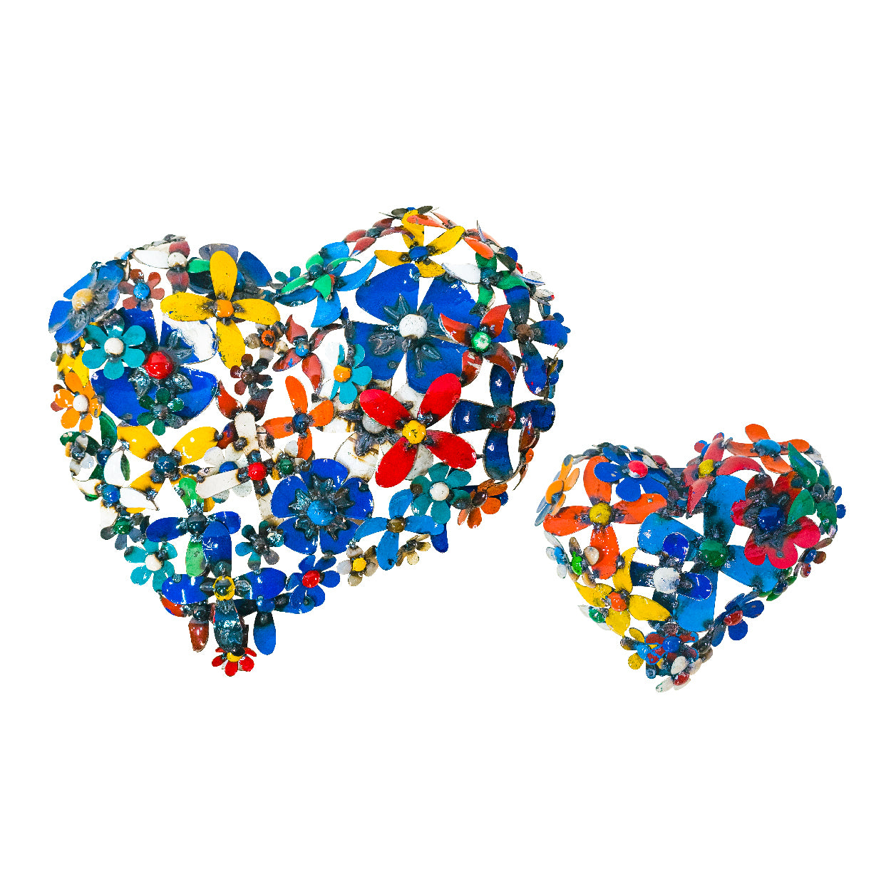 The Blooming Hearts (Set of 2) features colorful flower heart shapes, making it a perfect decorative wall art. Crafted from recycled and upcycled materials, each piece is handcrafted, adding a unique and eco-friendly touch to any space.