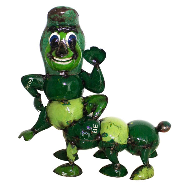 Casey the Caterpillar, a captivating sculpture that will add a touch of whimsy to your home and garden decor. This unique piece, designed by Aaron Jackson, draws inspiration from the famous fairytale Wonderland. Crafted by hand using recycled materials, Casey showcases a green caterpillar shape with a friendly wave of its hand. With its intricate details and vibrant colors, this statue is a must-have for any art lover.