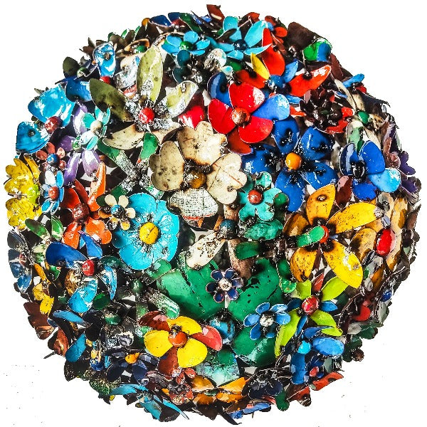 Introducing the exquisite Full Bloom Garden Sphere Large, a limited edition masterpiece by renowned artist Aaron Jackson. This oversized sculpture is a stunning display of colorful metal flowers, perfect for adding a touch of luxury to your home and garden decor.