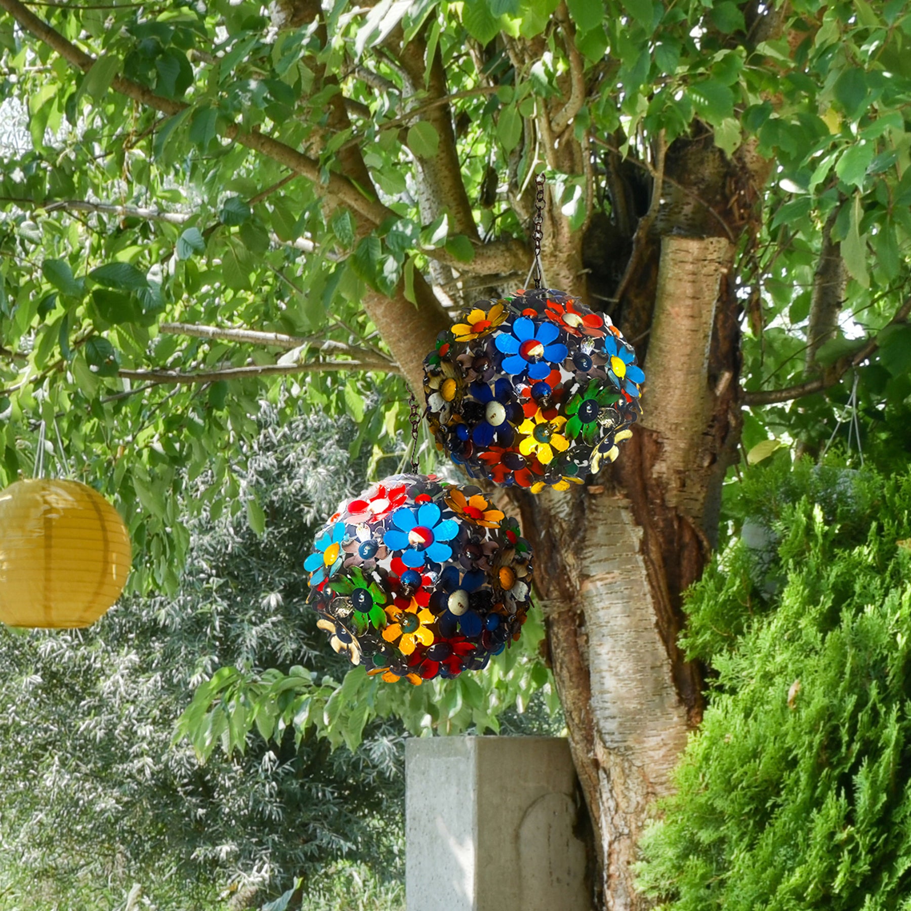Brighten your garden with the vibrant charm of this Full Bloom Garden Sphere. This handmade sphere has been handcrafted from recycled materials. The vibrant colors of each bloom will bring an explosion of color to any space. Add whimsy and cheer with this unique piece.