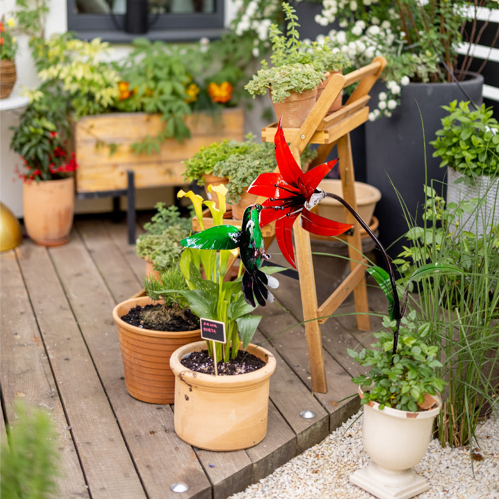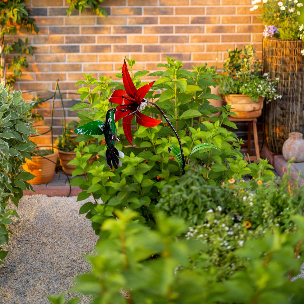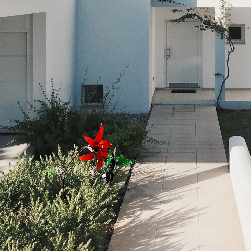 The Hummingbird Garden Stake brings a vibrant, nature-inspired charm to any outdoor or indoor space. Featuring a beautifully crafted hummingbird in flight near a bright red flower, this piece is made from recycled metal, adding both artistry and environmental responsibility. Perfect for flower beds, planters, or garden pathways, the stake and bird add a lively, whimsical touch to any setting. Please note, the product includes the stake and the bird design only and does not include the wood base.