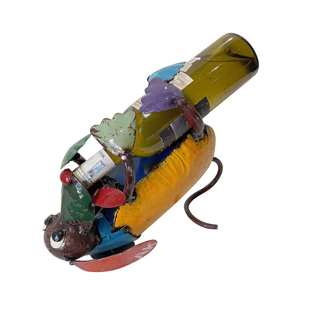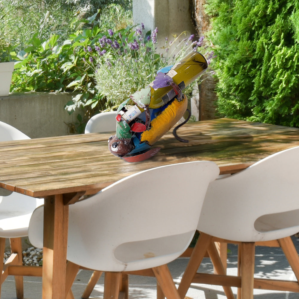 Add a dash of playful charm to your home with this whimsical Drunken Dog Wine Bottle Holder. Crafted from recycled materials, this piece is as functional as it is fun. Each piece has been cut and welded by hand, giving each sculpture unique character. This piece will be a great conversation starter and a fun addition to your kitchen or wine cellar.