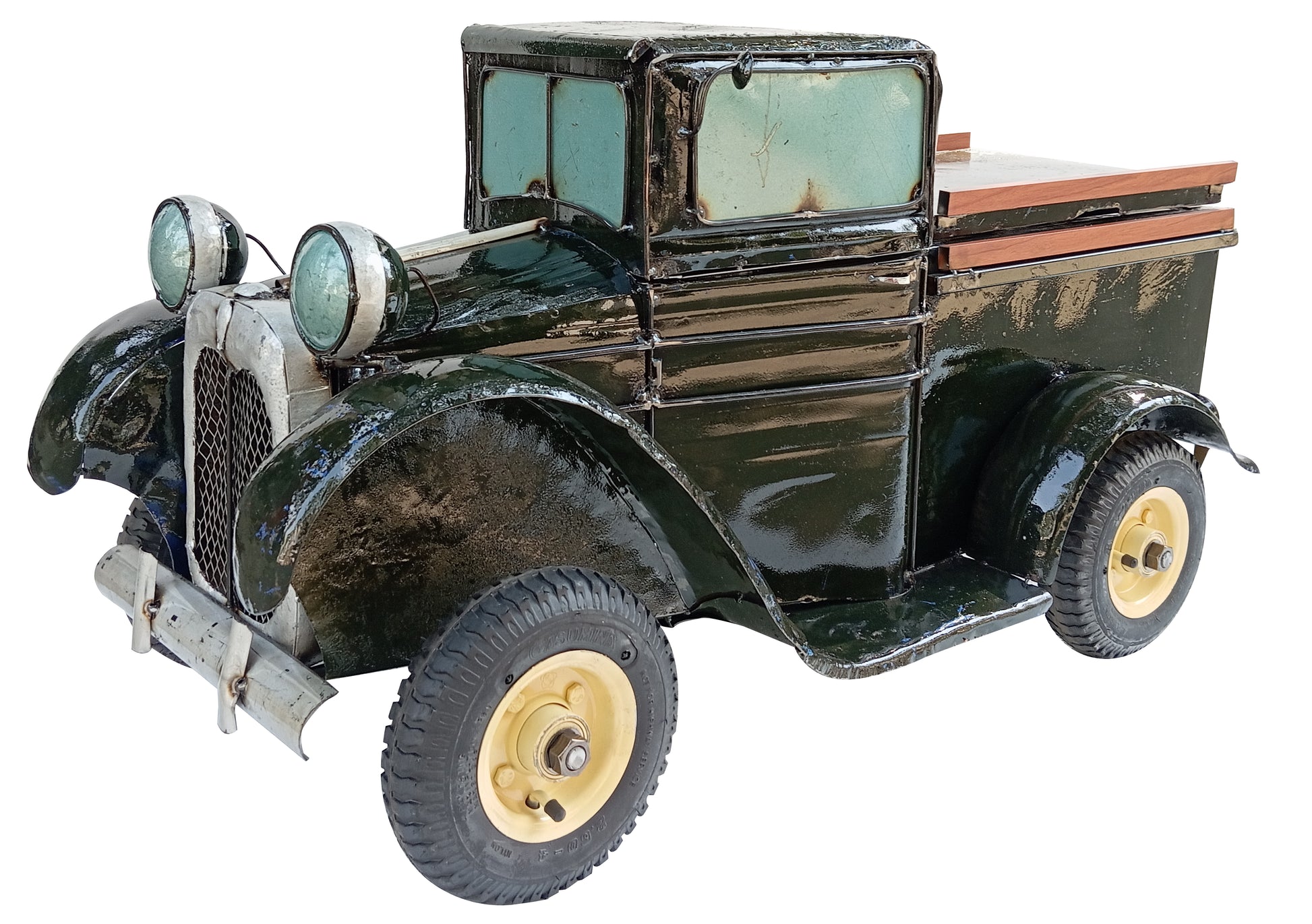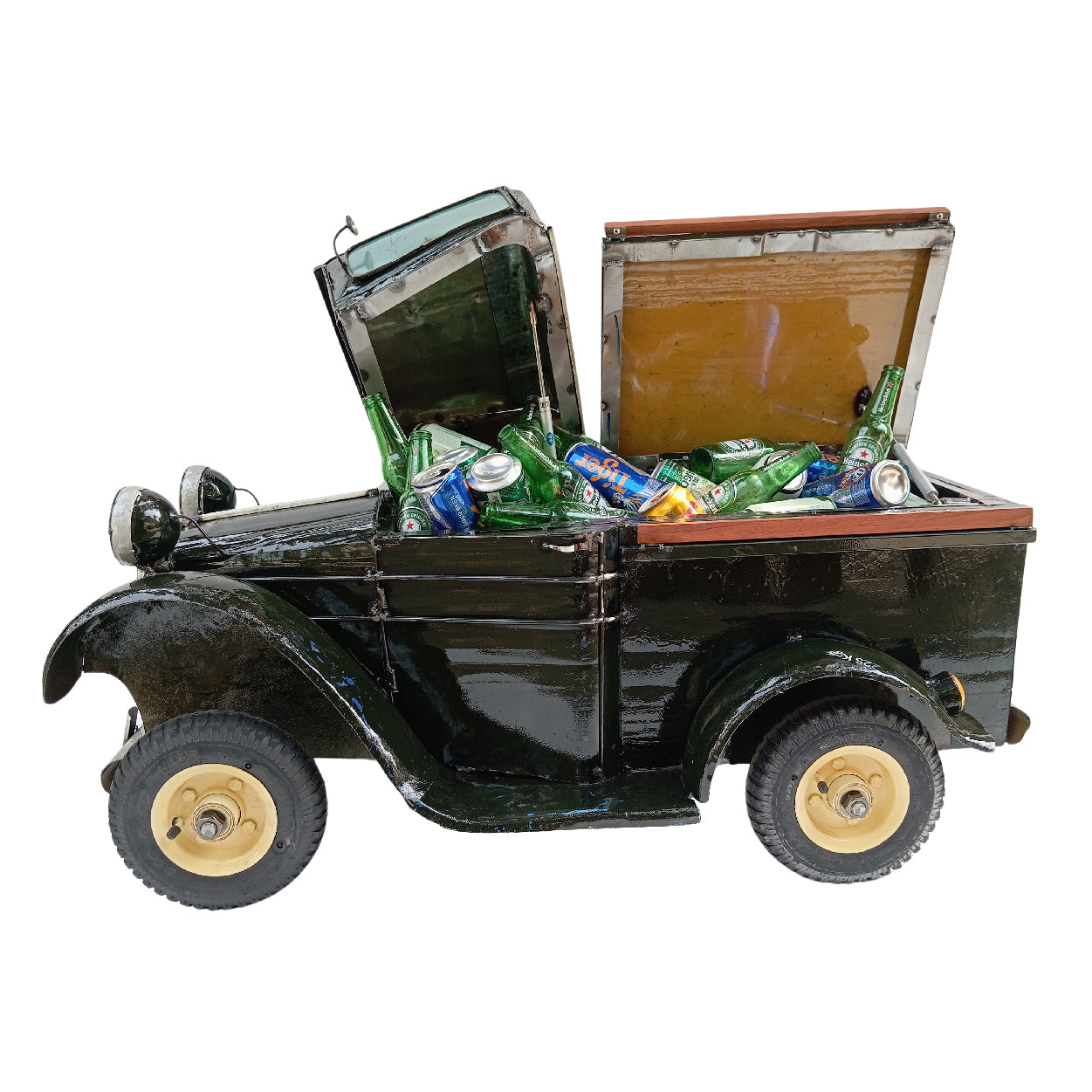The upcycled design of Vintage Pick-Up Truck Cooler - Olive Green ensures that each piece is one-of-a-kind, with its own distinct character and charm. The old green truck with cooler function is not just a functional cooler but also a conversation starter, sure to impress your guests and stand out from the crowd. Whether you're heading to the beach, a barbecue, or a camping trip, this Vintage Pick-Up Truck Cooler is the perfect companion for keeping your drinks cold and your style hot. Embrace the retro vibes and make a statement with this eye-catching piece that combines practicality with a touch of whimsy.